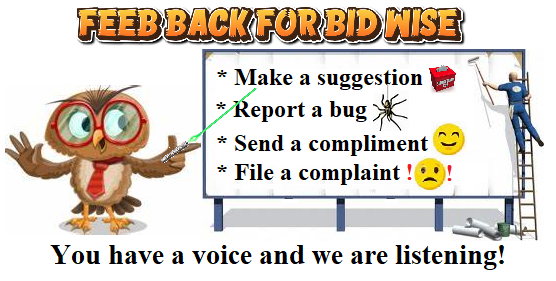 Here at Bid Wise Online Auctions, we value your input! We are nothing with out you, our valued customers / members. On this page you will find different ways to leave us feed back. Below will be listed polls and other methods while In the upper right hand corner, you should see a blue “Feed Back” bar or blue box with a “F” in it. If not you can