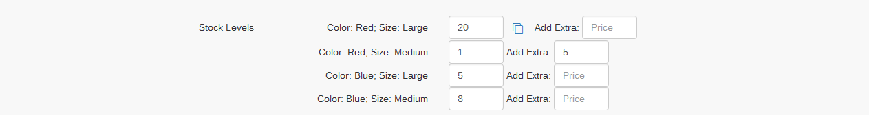 Select available colors and sizes. Then, select available quantities for each color and size: